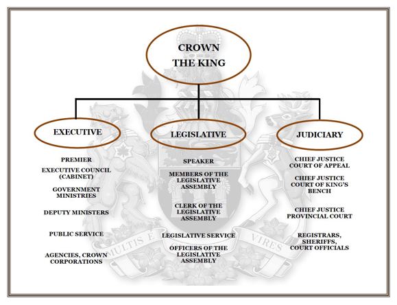 The Saskatchewan government is made up of three branches: the executive, the legislative and the judiciary. All of these components are linked through the Crown, which is the head of state.